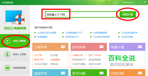 点击左边“自助工具救援”,在搜索栏输入“浏览器上不了网”,点击“查找方案”。