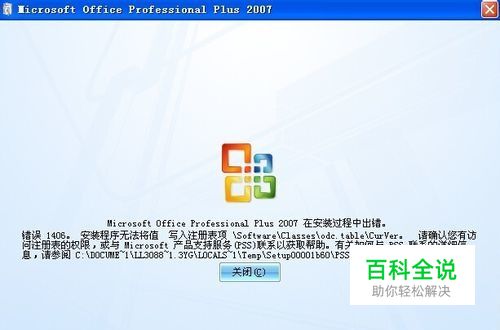 我们在安装office 2007的时候,会出现以下信息,错误1406,安装程序无法将值写入注册表项,需要联系管理员权限,导致无法安装