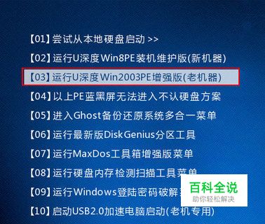 将制作好的u深度u盘启动盘插入电脑接口,开机按快捷键进入主菜单界面,选择“【03】运行U深度Win2003PE增强版(老机器)”,如下图所示: