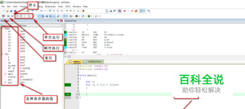 它不同于我们的其它程序的仿真,这里的单步运行默认走的是汇编语言 在右下角和左边窗口可以查看我们的变量和寄存器的值,方便我们查找错误或死循环 左上角的按钮可以进行单步运行或停止运行程序 顺序执行程序一般需要添加断点,断点的添加直接在每行的开头双击就可以了 退出调试再点击一次调试按钮就可以了