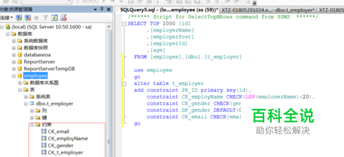 1、添加SQL语句,输入命令为: use employee go alter table t_employer add constraint PK_ID primary key(id), constraint CK_employName CHECK(LEN(employerName)<20), constraint CK_gender CHECK(gender=0 or gender=1), constraint DF_gender DEFAULT(0) FOR gender, constraint CK_email CHECK(email like '%@%') go 2、执行语句;
