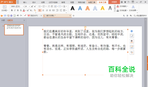 打开WPS演示文稿软件,新建幻灯片,选中标题内容文本框,按delete键删除系统自动的标题文本框内容幻灯片。选中插入文本框,按下鼠标左键,输入文字,按回车键输入成端文字内容。