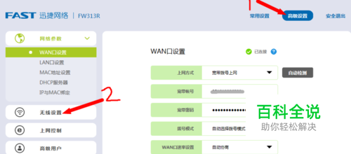 进入到路由器设置页面,先点击“高级设置”然后点击“无线设置”,