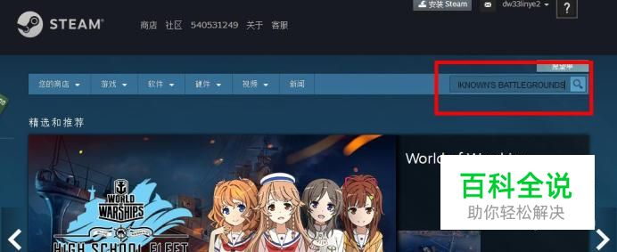 然后在旁边的搜索栏输入PLAYERUNKNOWN'S BATTLEGROUNDS,进行搜索。