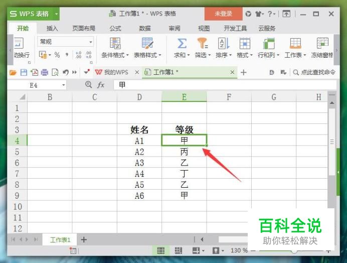 进入表格主界面后,制作一个简单的表格。我们的目的就是按照“甲乙丙丁”等级的顺序对其进行排序。首先选中等级下方的任意一个单元格,如图所示: