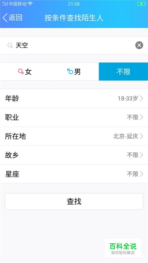 之后我们为了精确的查找好友,可以输入和选择好友的其它信息,点击下方的查找,如图所示。