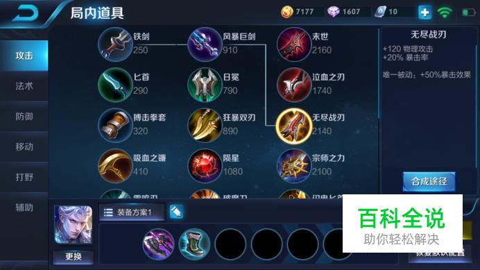 中期装备 暗影战斧+抵抗之靴+无尽战刃+宗师之力 到了游戏中期,我的恺会选择先出一把无尽战刃。无尽战刃这件装备,能够提高凯的物理攻击的同时还能够最大限度地提高凯的暴击率。中期的第二件装备的话,我的凯会出宗师之力,不仅能够提高凯的物理攻击,还能够提高凯20%的暴击率和凯的蓝上限县和血上限。