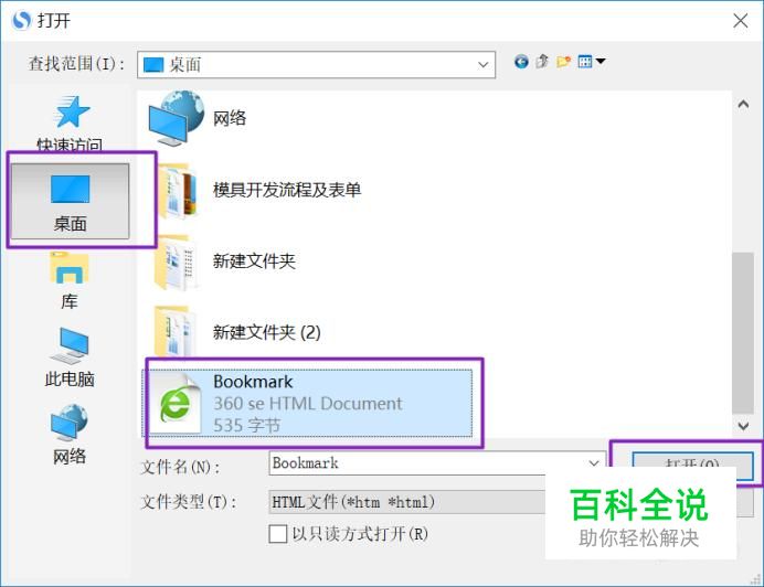 弹出界面选择桌面,选择刚刚粘贴放在桌面上的HTML文件,点击打开;