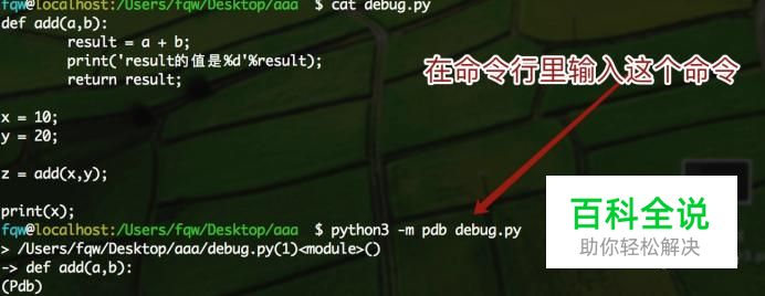 我这里用的python3的环境,在终端里输入如图显示python3 -m pdb debug.py命令。就是就是用python的pdb模块调试debug.py文件代码。