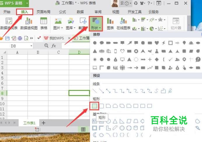 进入表格主界面后,在上方菜单栏中选择“插入”选项,然后在其子菜单中选择“形状”工具,接下来在新弹出的各种形状中选择“矩形”为例,如图所示: