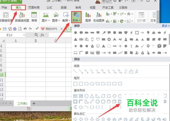 进入表格主界面后,在上方菜单栏中选择“插入”选项,然后选择“形状”,在新弹出的图案界面中选择“同心圆”为例,如图所示:
