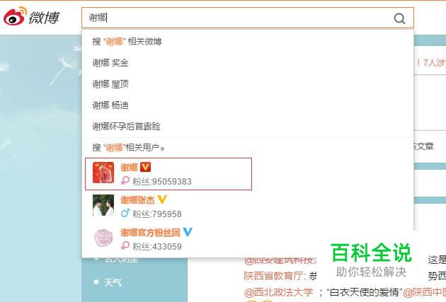查找你所要加的群的群主或某个博主粉丝群的这个博主。比如,我们想加入谢娜的粉丝群,我们在搜索栏中输入“谢娜”,点击进入她的个人微博。