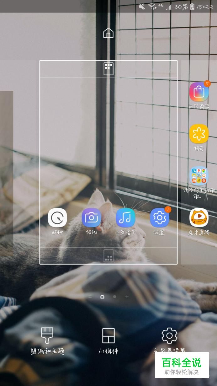 首先我们将手机显示到主屏幕,两根手指同时向手机屏幕中间滑动,就像我们平常缩小图片那样,然后点击右下方的“主屏幕设置”。