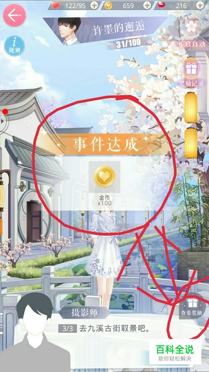 然后随便选择一个男主进入任务,点击【出发】即可开始,然后到达目的地点击粉红色的地方即可,过程中遇到回答问题时,可随意选择答案,没有固定选择。然后继续,点击前往开始下一小节。右下角可以查看单次任务奖励,右上角可以查看已经获得的任务奖励,如图