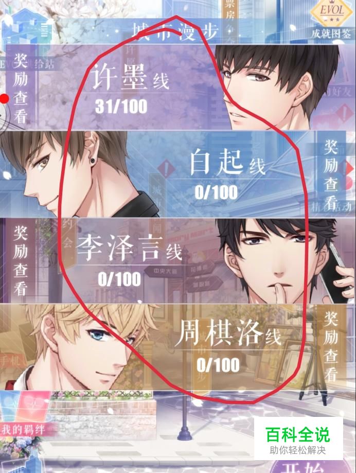 点击进入城市漫游后我们可以看到城市漫游有四个大的部分,每个男主一个部分,然后每个男主部分由100个关卡组成,每一个小关卡里面有3至4个小节。接下来我们点开一个男主查看一下规则,规则主要讲解了城市漫游的组成,步骤,掉落的奖励,和重置的时间和限制,如图
