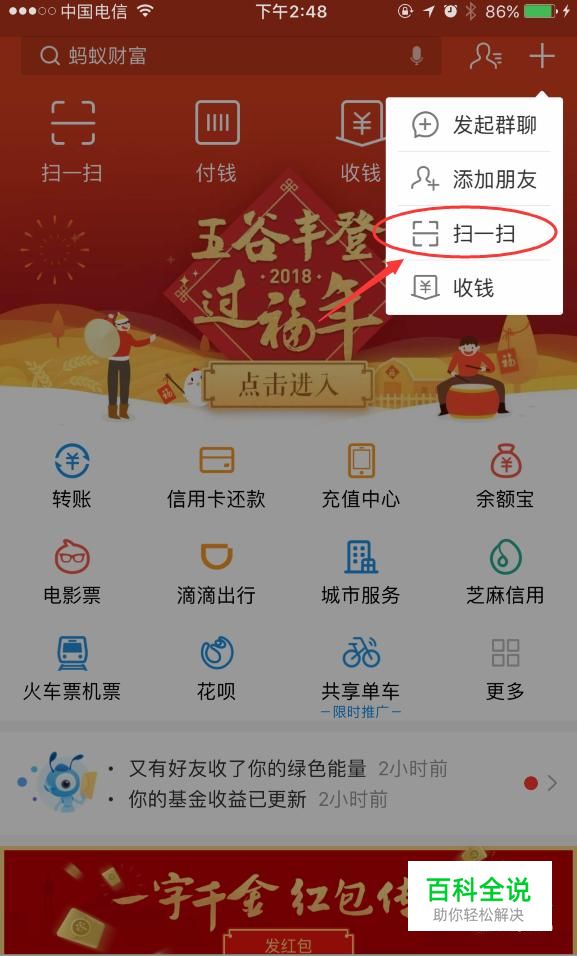 今年通过AR扫福字集福卡共有两种方式。 首先打开支付宝APP,这时有两种方式进入AR扫描界面,一种是打开“扫一扫”