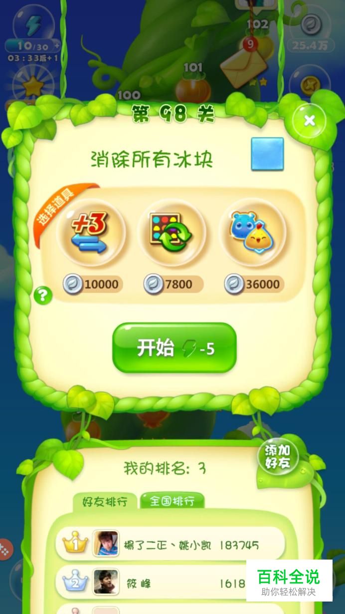 首先打开开心消消乐程序,第98关,此关并不困难,所以可以不使用道具,如果金币充足想使用道具的话,最便宜那个就好啦
