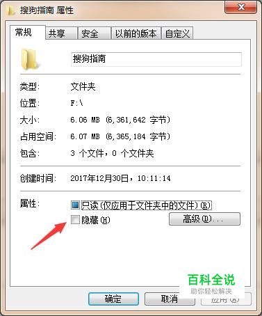 进入到属性界面,然后将属性勾选为“隐藏”点击应用