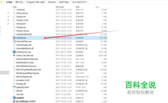 进入电脑管家根目录后,下拉找到文件Uninst.exe,鼠标双击。