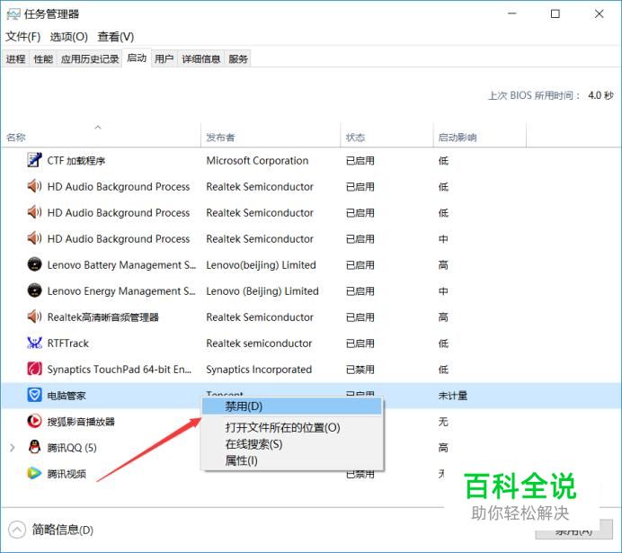 调出任务管理器以后,点击启动,在启动里找到电脑管家,鼠标右击,选择禁用即可。