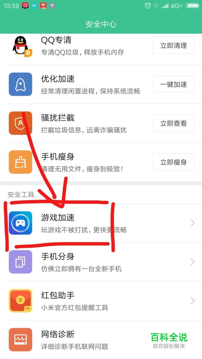 打开“安全中心”之后,往下滑动,你就会看到“游戏加速”,如图: