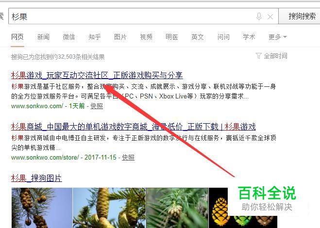 首先我们打开搜狗搜索,然后输入杉果关键词,进入杉果游戏官方网站(如图所示)。