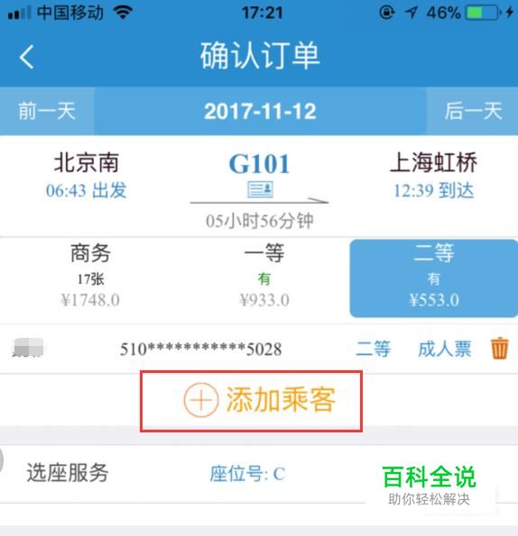 进入订单填写页面,选择您要乘坐商务座、一等座或二等座,再添加乘坐人的姓名、身份证号码以及电话号码等基本信息填写完毕后点击“保存”,填写完毕相关信息后,点击“提交订单”即可预定车票。