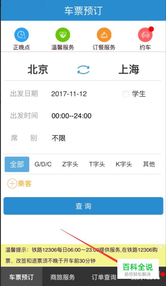 预定车票 进入车票预订页面,选择您的出发地点,再选择您的到达地点,如:北京到上海,再选择您的出发日期、时间,若您是学生,在学生前的方框内打上勾,若不是则不必理会,选择完毕点击“查询”。