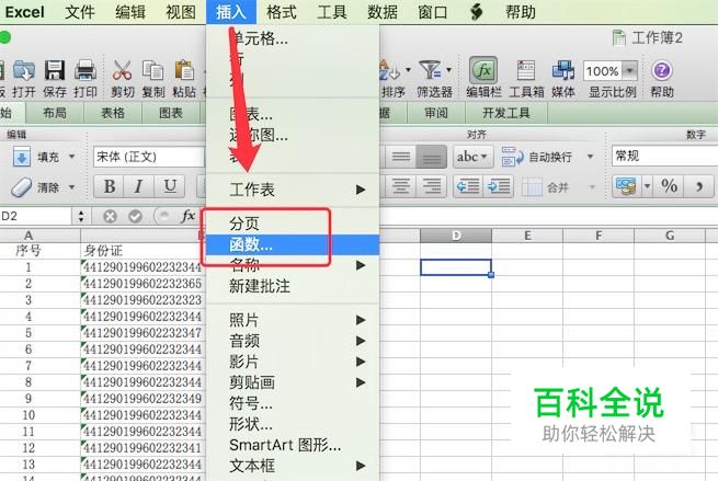 点击选中D2单元格,点击菜单栏上的‘插入’,弹出菜单后,点击上面的‘函数’