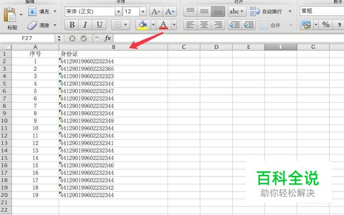 打开excel,打开一份文档数据,其中B列就是身份证号,假设我们要提取身份证的后5位数字,看下怎么做。