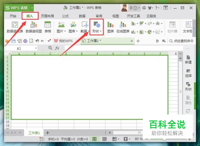 进入表格主界面后,点击菜单栏中的“插入”工具,然后在其子菜单栏中选择“形状”选项,如图所示: