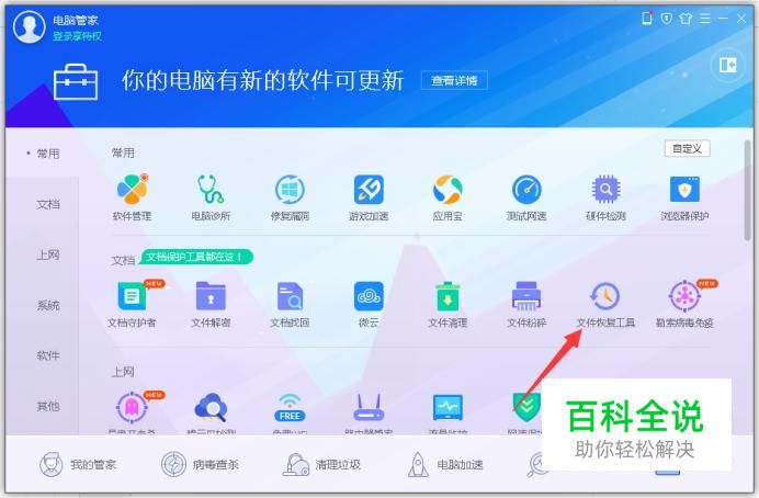 因为这类问题一般通过修改注册表还原回收站的方法已经不管用了。只有通过专门的文件恢复软件来帮助我们了。这里我选择以电脑管家为例。打开电脑管家,选择工具箱。