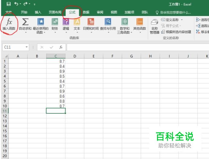 以下图数据为例,把光标放在c11处,然后点击“公式”,选择“插入函数”。