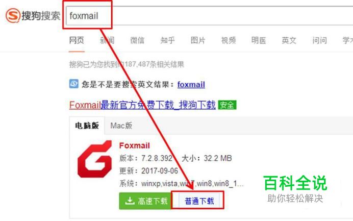 在搜狗搜索引擎中输入Foxmail点击搜索,在搜索结果中第一个就是这个软件,选择普通下载,下载完成后双击该软件的安装文件,根据提示,完成软件的安装。