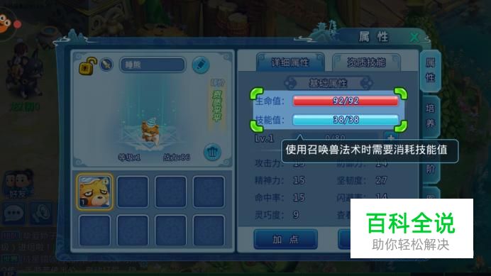 进入后在左侧列表中点击召唤兽,在右侧可查看生命值和技能值,使用法术技能的时候会消耗相应的技能值。