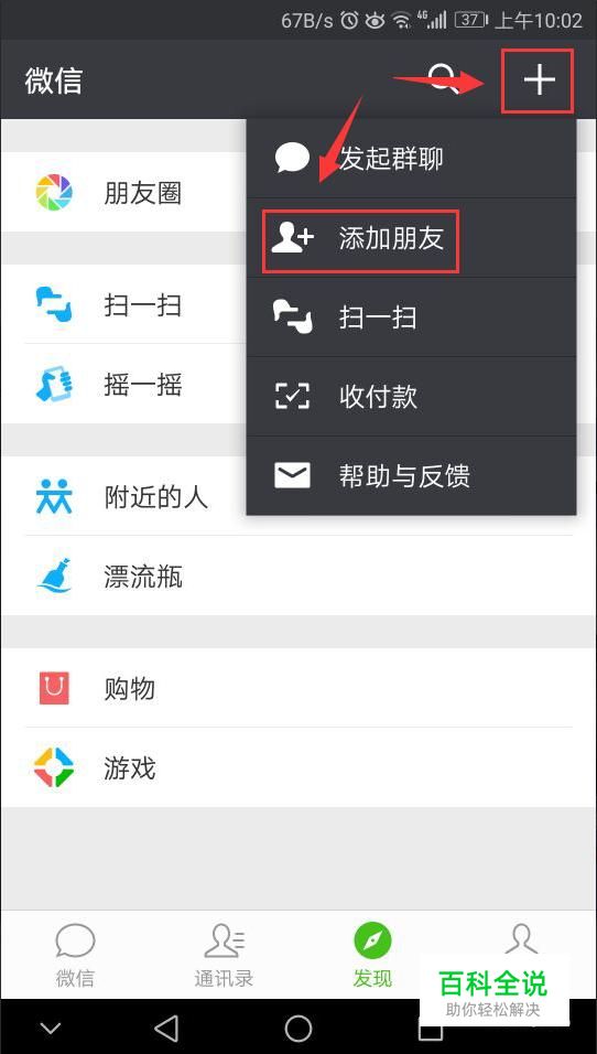 来到微信,我们点击上方的小加号,接着在出现的窗口点击“添加朋友”,如图所示。