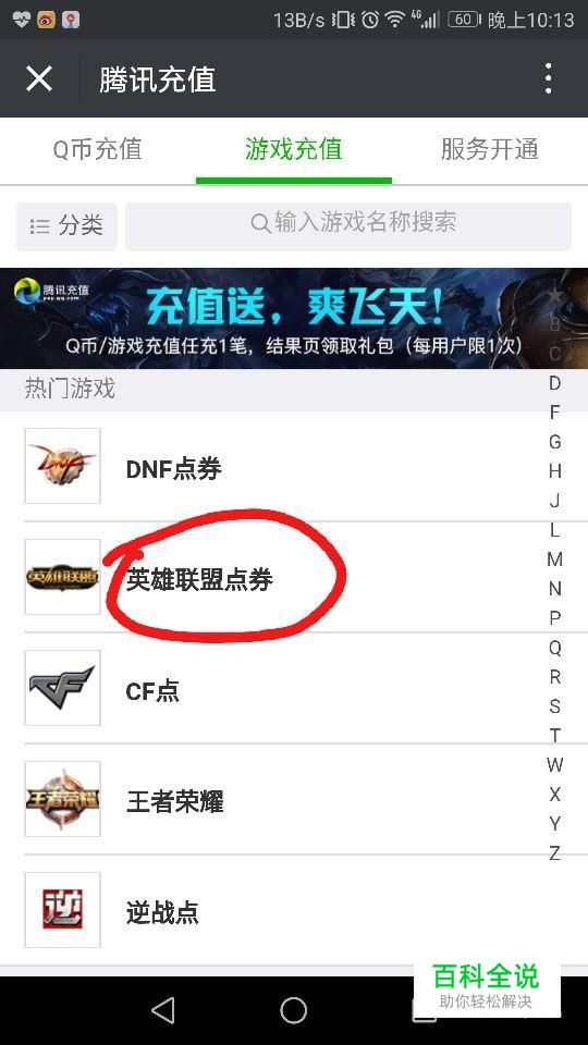 进入游戏充值的界面后选择需要充值点券的游戏(例如英雄联盟),如图所示。