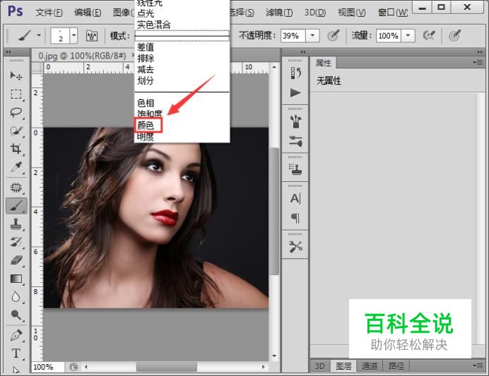 选择画笔工具,在画笔混合模式里选择颜色选项,如图所示: