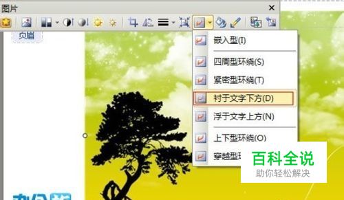 将图片设置为“衬于文字下方”,可以通过拖动图片,调整图片位置。单击图片,会出现“图片工具栏”。单击“文字环绕”按钮,选择“衬于文字下方”。