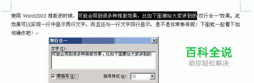 在弹出的“双行合一”对话框中可以预览效果。当然,你也可以给它加上括号,这个可以自由选择。(如下图)