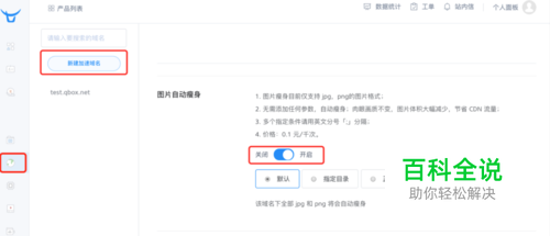 在出现的 创建加速域名页面找到 图片自动瘦身栏