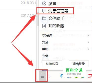首先我们用电脑登上QQ,然后点界面左下角红色方框里面的图标,在弹出来的选项中选择"消息管理器"。
