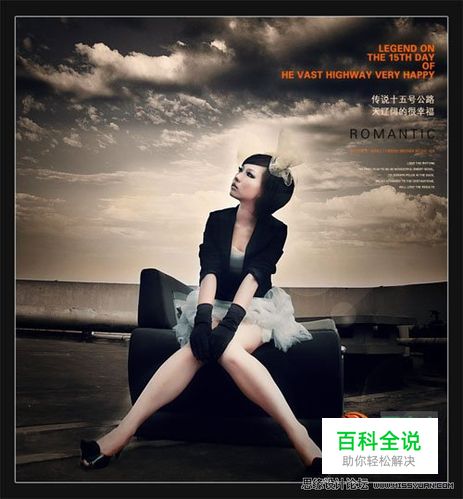 15、新建空白图层,选择黑色线性渐变,四周拉暗角,图层模式改为柔光。 最后合并图层,添加装饰文字,完成最终效果。