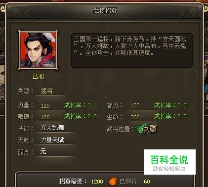 招募吕布 不说废话了,自己看了都嫌...80级的龙将金将有大乔、貂蝉、张飞、吕布、诸葛亮、司马懿。Guan5龙将里,初见吕布是在70级的赤壁副本,吕布是最后的大BOSS,杀伤力大家过赤壁副本的时候应该大致都了解了。先升级到80级,然后去酒馆猜拳,猜拳把金色武魂累积到到1200点的时候,就可以招募吕布了。吕布是猛将职业的,吕布放中军比较合适,中军是战斗力的最主要部分嘛。