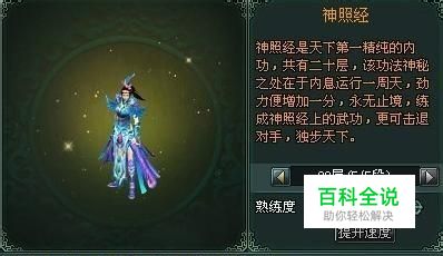 神照经的技能,在运功之时,带起一股凌厉罡气护体,罡气如蛟龙行空,以万钧之势击退周围敌人,从而利于不败之地。神照经是主动技能,技能冷却时间为60秒。技能没有层数限制,越高层次的技能在对层数低的对手时,越容易击退;反之,对手技能层数越高,越无法击退。