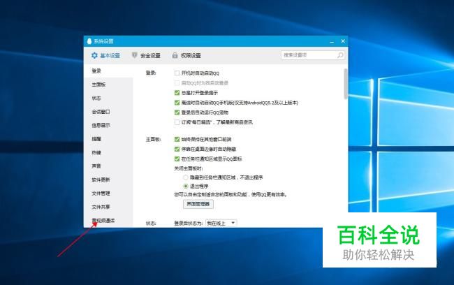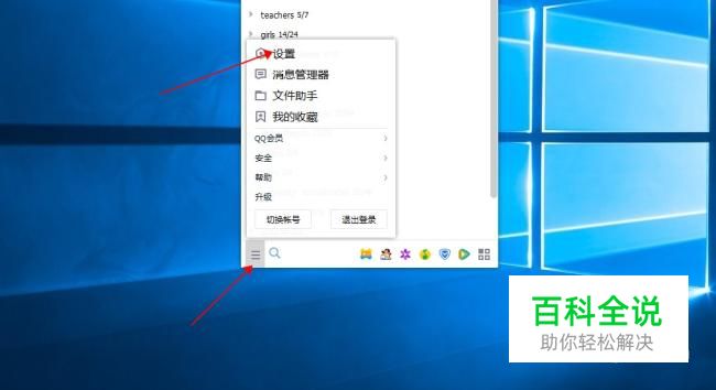 首先,用电脑打开QQ聊天栏,点击左下方箭头所指的位置,然后点击“设置”选项