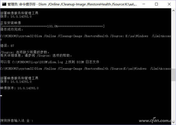 因为DISM需要联机到微软服务器进行系统文件比对和验证,如果你的网速较慢,可以自行先准备好和当前Windows 10对应的的安装文件,然后将其中的“install.wim”提取到E:\备用,在命令提示符下输入“dism /mount-wim /wimfile:e:\install.wim /index:1 /mountdir:k:\aa”,将镜像加载到k:\aa(需要预先建立该目录),继续输入“Dism /Online /Cleanup-Image /RestoreHealth/Source:K:\aa\Windows /LimitAccess”进行手动修复也可以。