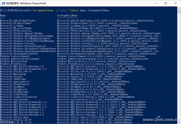 在搜索框输入“powershell”,以管理员身份启动系统自带的Windows Powershell组件,接着输入“Get-AppxPackage -allusers | Select Name, PackageFullName”,通过该命令获取当前系统安装的所有应用。