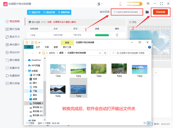 第三步:启动转换前设置输出目录文件夹,作为转换后接pg图片的保存路径;设置成功后点击【开始转换】按钮,接下来的转换动作软件会自动完成,并在完成的一瞬间弹出打开输出文件夹,便于用户直接查看使用转换好的jpg图片。