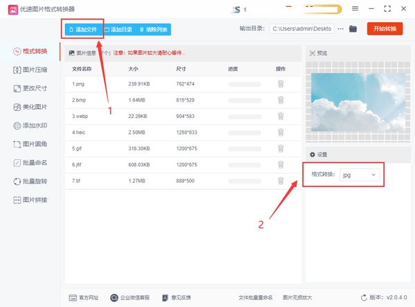 第二步:点击软件左上角的【添加文件】按钮,这个按钮可以将我们需要转换的图片文件全部添加到软件中,另外软件本身是支持批量转换的,用户可上传多个需要转jpg的图片文件;文件上传成功后,设置转换后的格式,在右侧格式下拉框中选择为“jpg”格式即可。